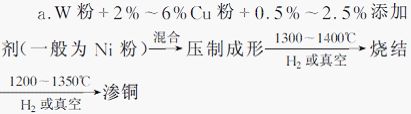 熔滲法分為高溫?zé)Y(jié)鎢骨架后滲銅和低溫?zé)Y(jié)部分混和粉后滲銅兩種方法。